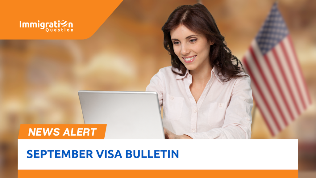 "A woman smiling while looking at a laptop, with an American flag in the background, and a news alert banner reading 'September Visa Bulletin' from Immigration Question."